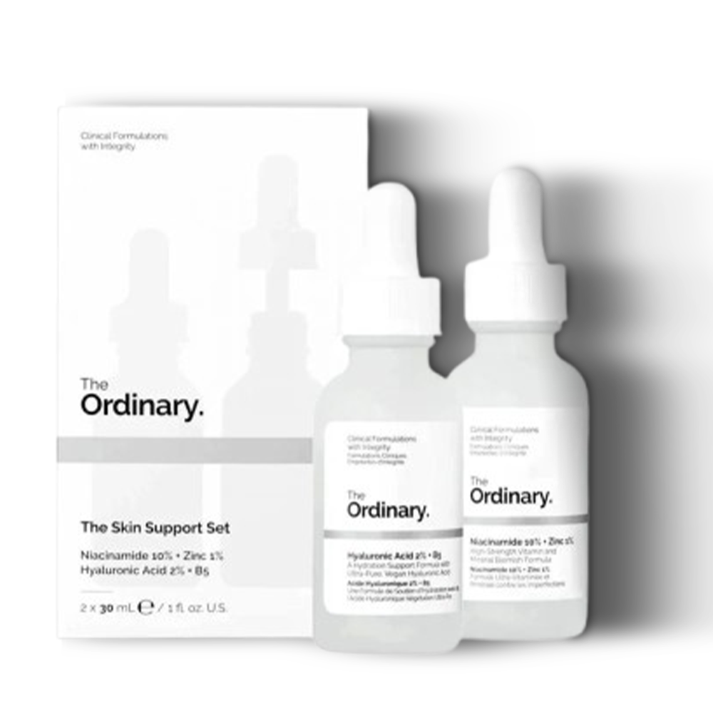 مجموعة “”Skin Support Set”” من The Ordinary تجمع بين اثنين من أشهر السيرومات : حمض الهيالورونيك 2% + B5، ونياسيناميد 10% + زنك 1%، لتمنحك ترطيبًا عميقًا وتحسينًا واضحًا في مظهر البشرة.